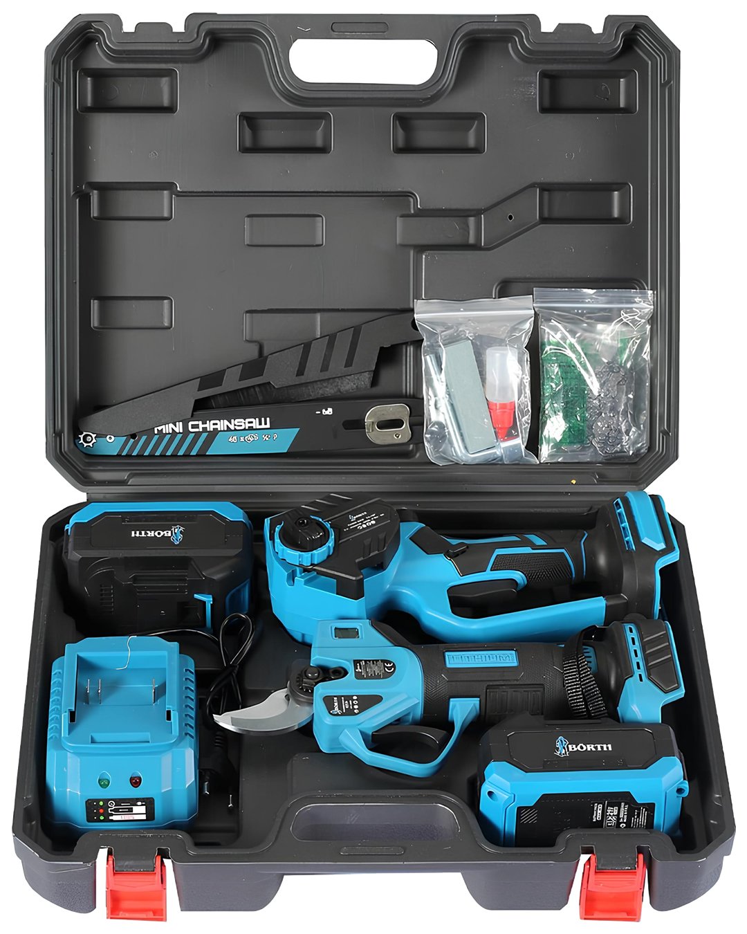 Professional Şarjlı Dal Budama Testeresi ve Budama makası 2 li set bir arada, çift akü ile işlerinizi kolaylıkla bitirin.Tek batarya ile 65 dk kesme imkanı sunuyor. 10cm ve 15 cm pala boyu ile tüm dalları kolaylıkla kesebilirsiniz.