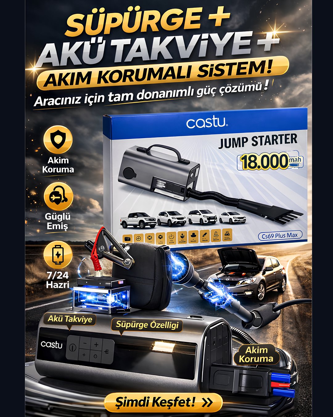 Castu 10in1 Jump Starter Süpürgeli Akü Takviye Cihazı 18000mAh Kompresörlü Powerbank