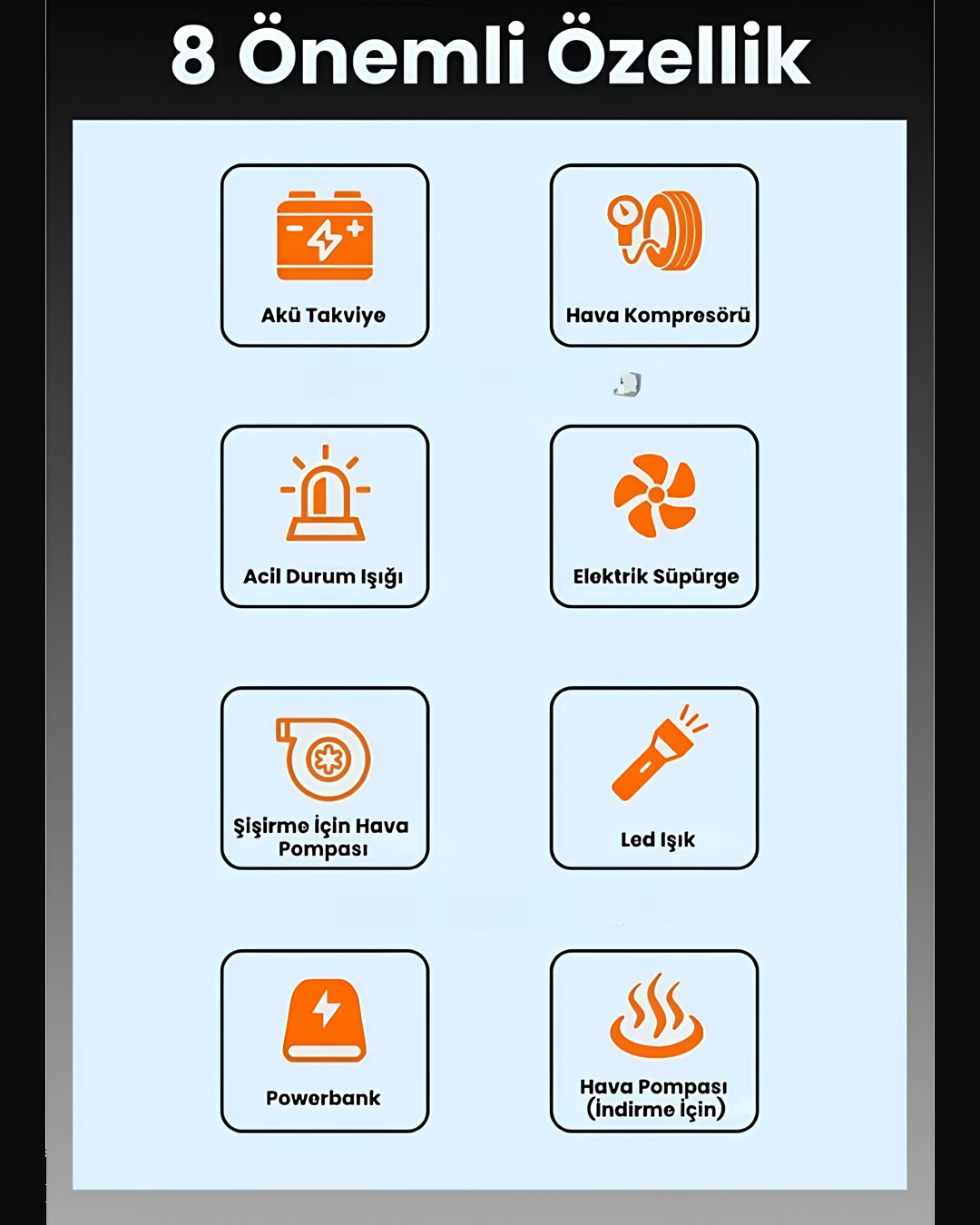 Fonksiyonlar Jump Starter, Kompresör, Süpürge, Powerbank, LED Fener