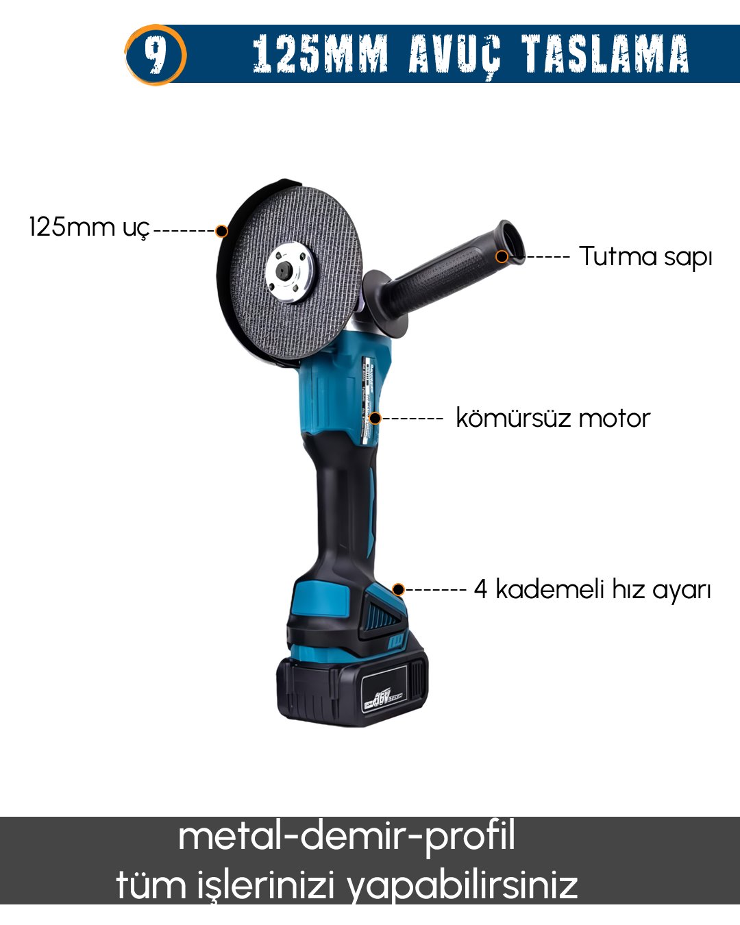 Led Işık +Lazer Metre +Somun Sıkma + Dekupaj + Oto Yıkama + Dal budama makası + Dal budama testere + Darbeli Vidalama + Spral + Kırıcı Delici Matkap + Çok Fonksiyonlu Taşlama