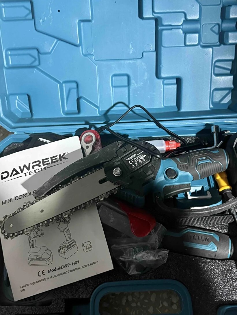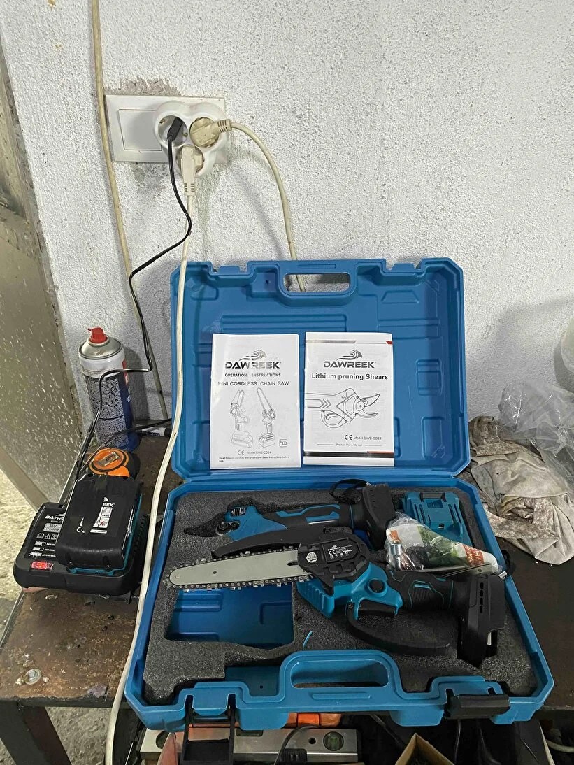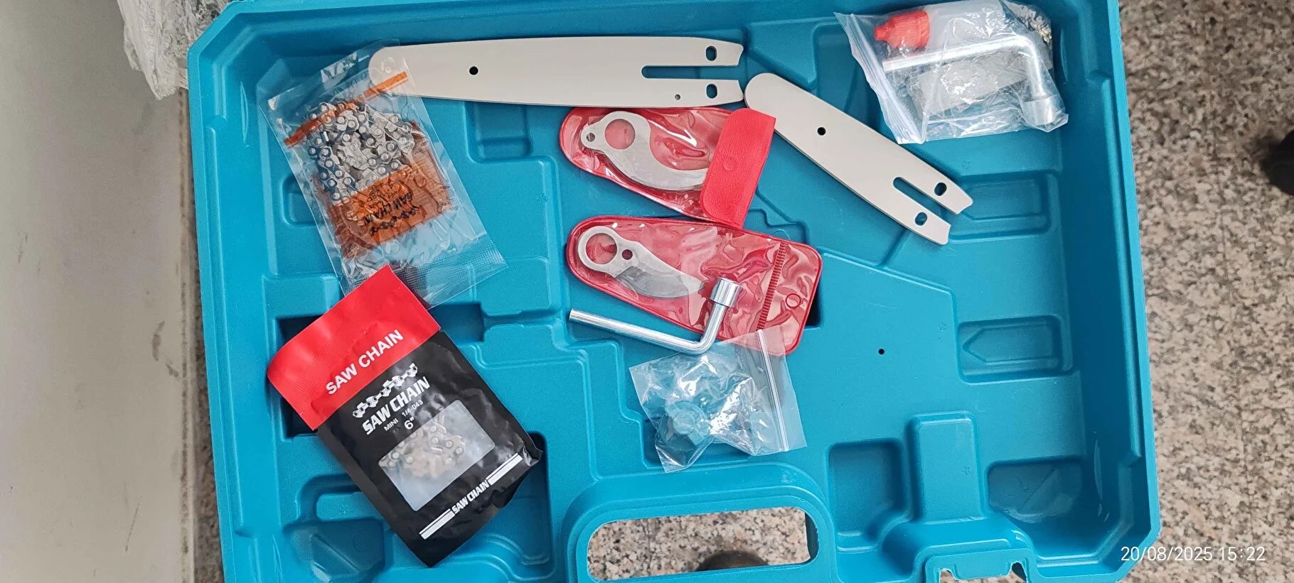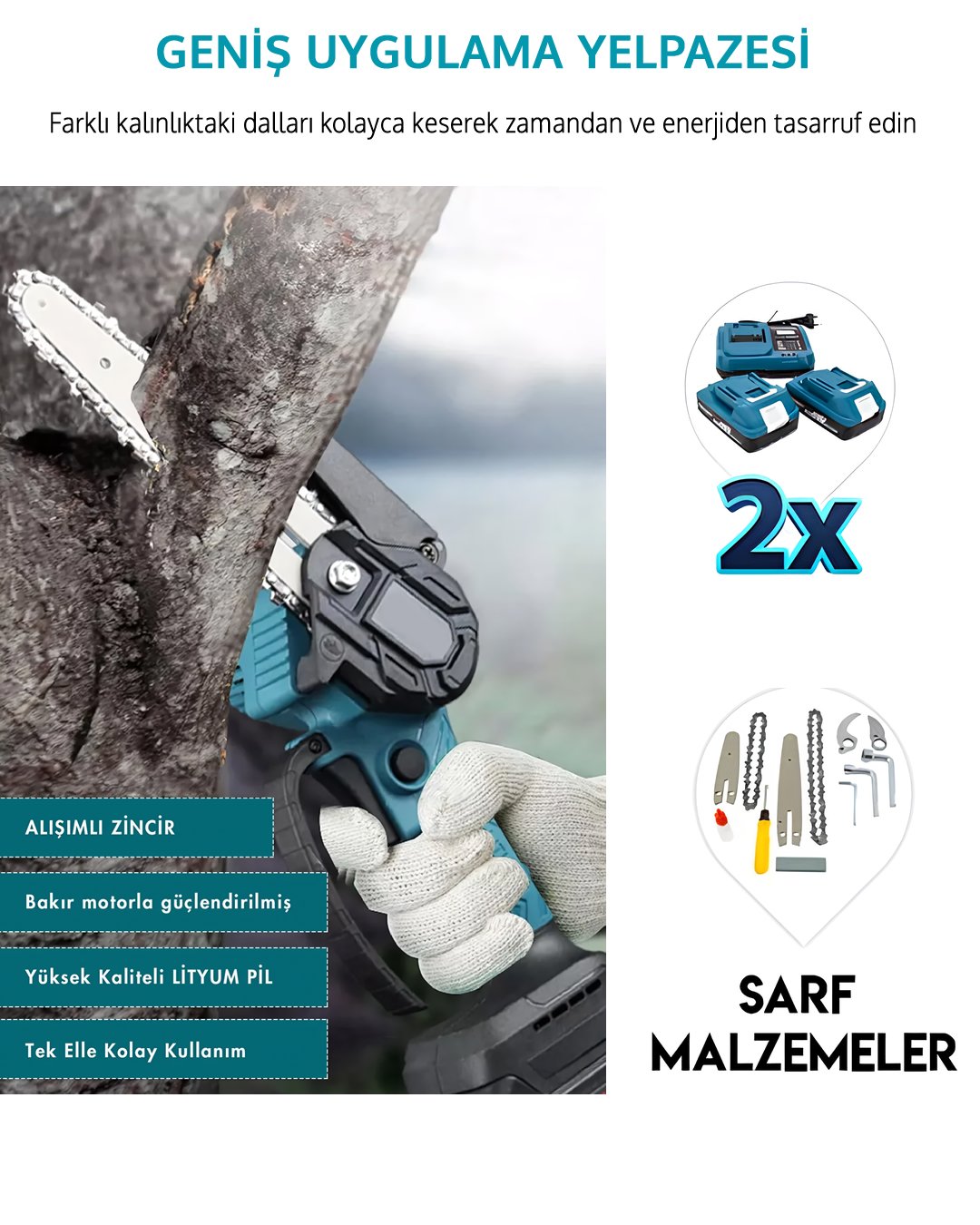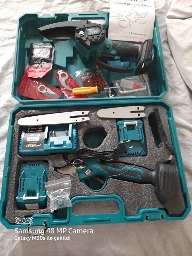 Aksesuarlar: 1 adet plastik kutu, 1 adet budama testeresi , 1 adet budama makası, 1 adet şarj cihazı, 2 adet Li-ion Batarya , 2 adet zincir , 2 adet pala, Ek Parçalar