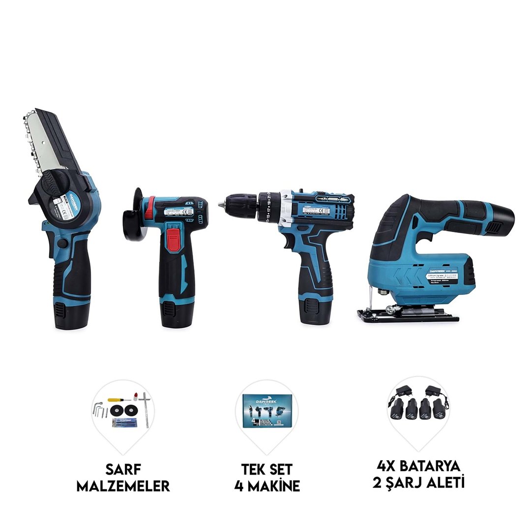 Parçalar :1 adet testere, 1 adet avuç taşlama, 1 adet vidalama, 1 adet dekupaj, 4 batarya, 2 şarj adaptörü,ek parçalar
