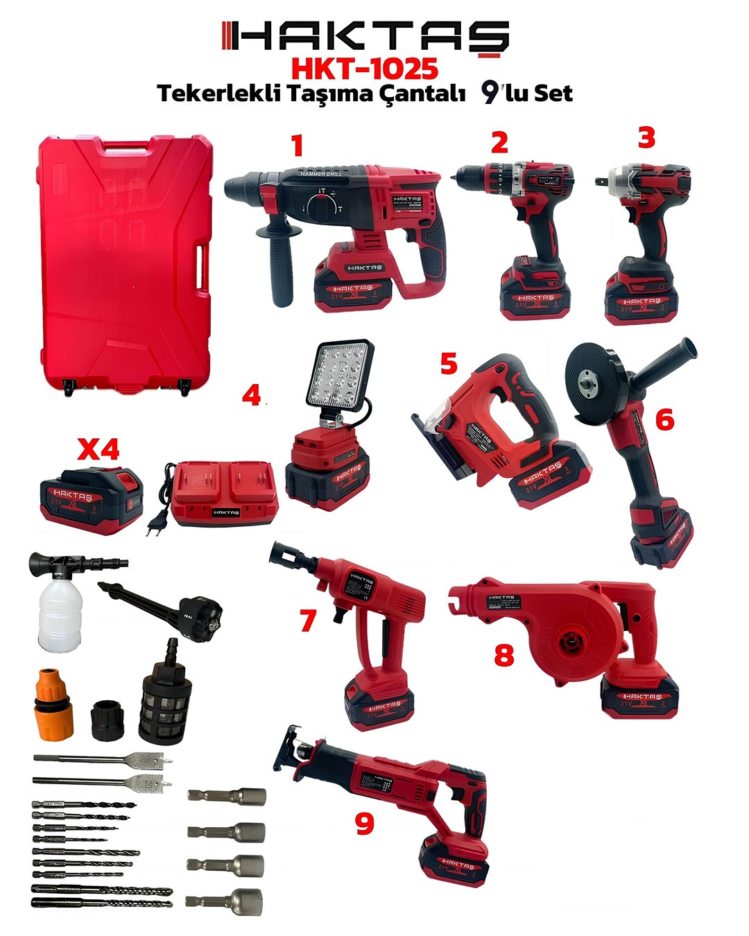 Yeni nesil geliştirilmiş akü teknolojisi haktaş hkt1025 kırmızı 9lu set, evde atölyede tüm işlerinizi kolayca halledin.