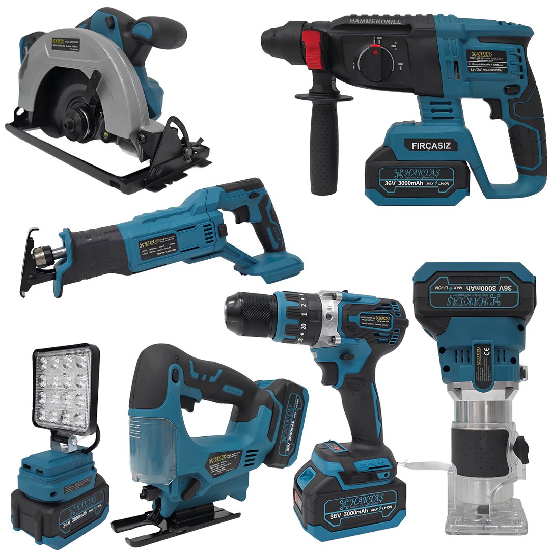 Ürün içeriği: 1 adet çantası, 1 adet kırıcı , 1 adet vidalama, 1 adet dekupaj, 1 adet daire testere, 1 adet freze, 1 adet led ışık, 2 adet şarj cihazı, 4 adet batarya ve ekstra parçalar
