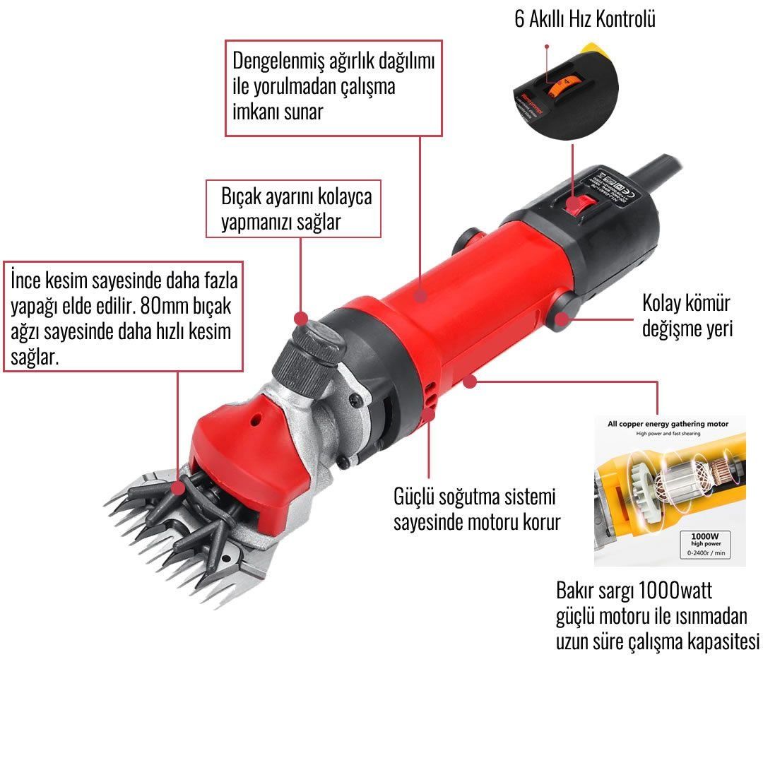 Prohummer keçi koyun kırkma makinesi elektrikli , 6 hız ayarlı , 1000 watt gücünde kolay kesim sağlayan en çok tercih edilen ürünler arasında yer alıyor. Lazer kesim yeni nesil bıçaklar sayesinde çok daha uzun ömürlü olup kendi kendini bileme özelliği yapısıyla bıçak değiştirmenize gerek kalmıyor.