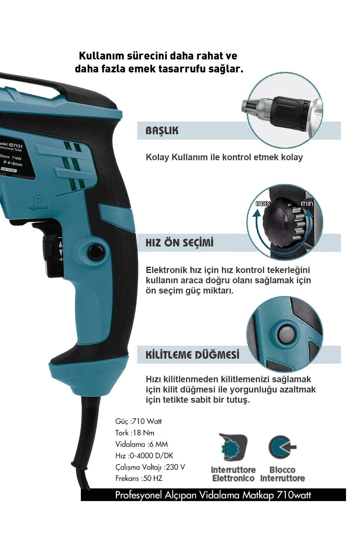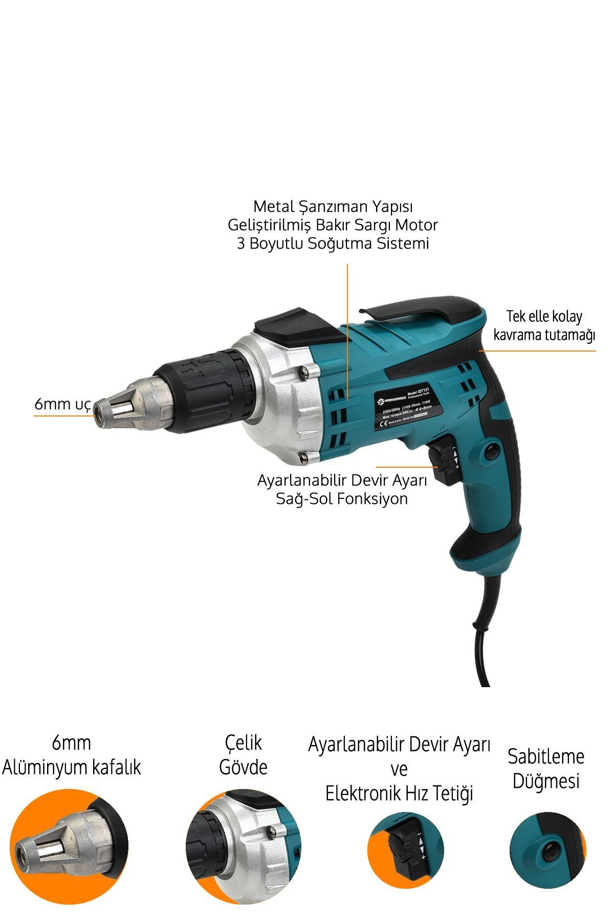 Prohummer alçıpan vidalama 710 watt , 4000 r/min ve 6mm vidalama özelliği bulunuyor.