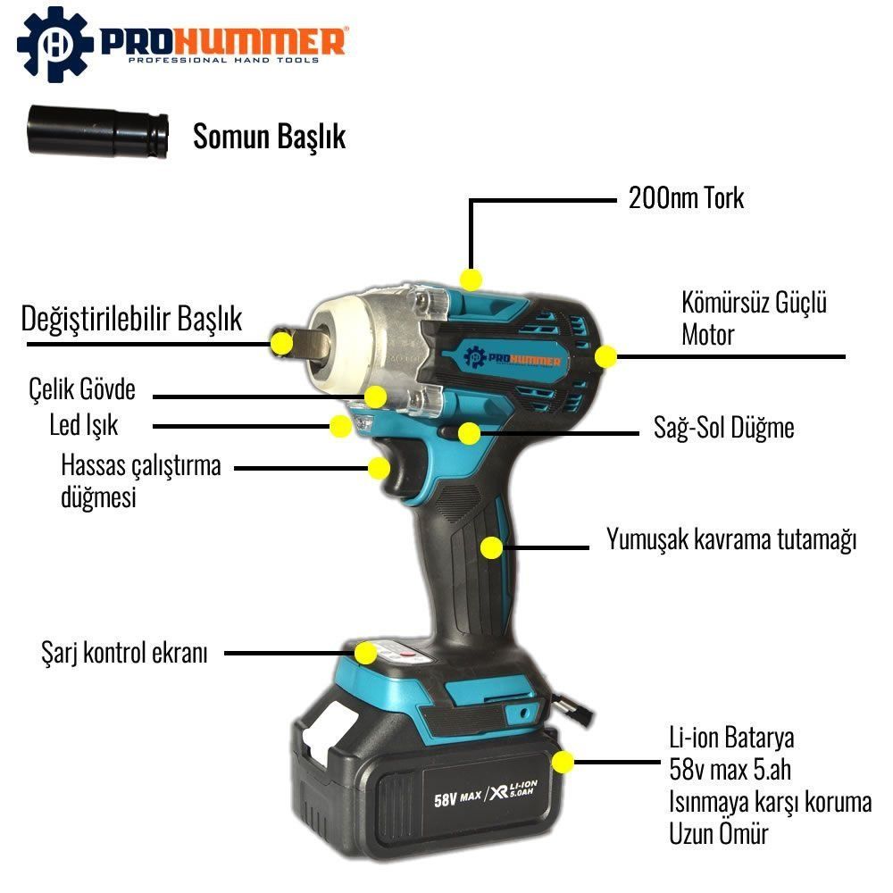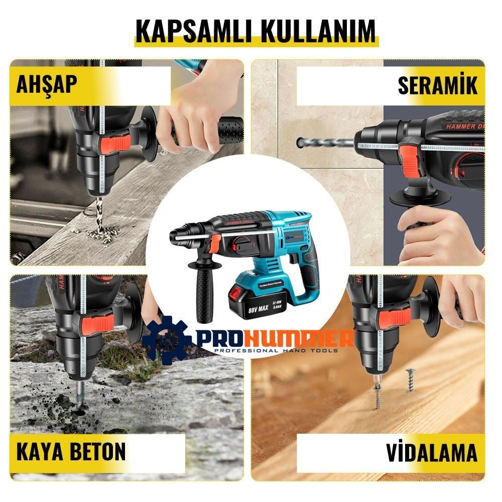 Prohummer PH093 Profesyonel Şarjlı Ultra 4lü Set Takımı Kırıcı Delici Somun Sıkma Taşlama ve Vidalama Matkap 58vf