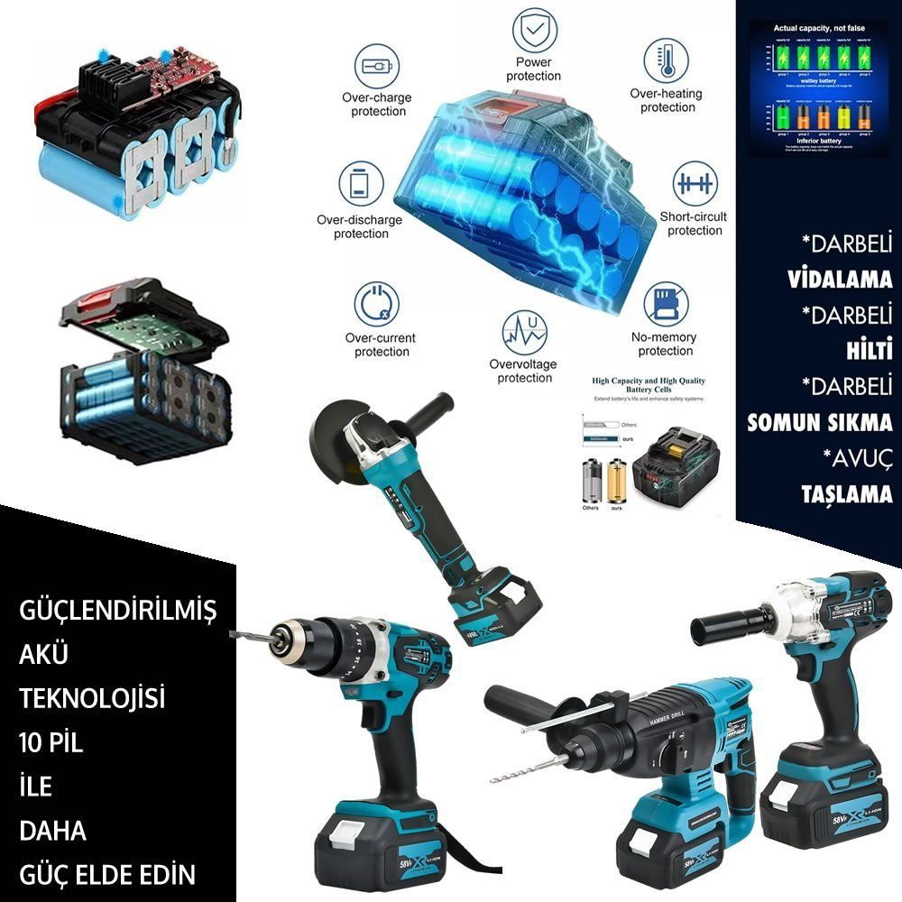 Profesyoneller için Kömürsüz Şarjlı torklu somun, Bijon, vida sıkma sökme, Şarjlı avuç taşlama , Kırıcı delici ve akülü vidalama matkap ile tüm özellikler bir arada