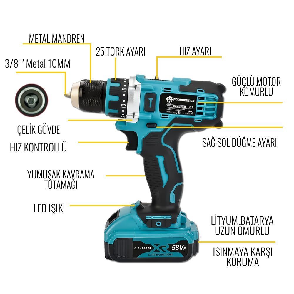 Prohummer 58vf 5ah full vidalama matkap seti ekstra parçalar ile tüm ev , işyeri ve ofiş işlerinizi kolayca halledin.