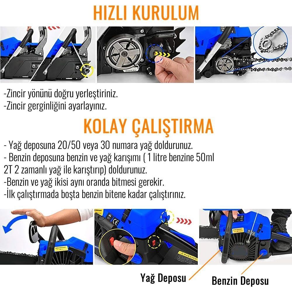 Aksesuarlar : 1 adet makine kutusu, 1 adet gövde, 1 adet zincir, Ek Parçalar