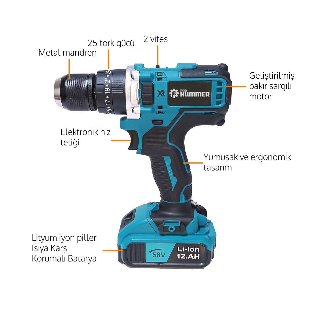 Prohummer xr şarjlı vidalama matkabın boştaki devir sayısı 2000 dev/dk. olup delme ve vidalama modu bulunmaktadır. Max. 18 tork ayarı ile güçlü şanzıman yapısı sunmaktadır. Hız ayarı sayesinde zorlu işlerde 1.kademede daha çok güç üreterek performans sergiliyor.
