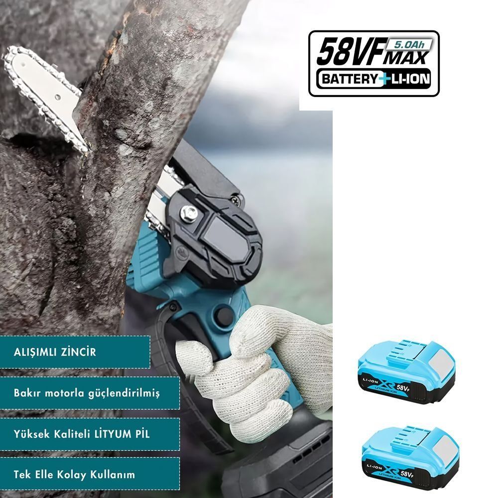 Professional Şarjlı Dal Budama Testeresi ve Budama makası 2 li set bir arada, 58vf 5ah çift akü ile işlerinizi kolaylıkla bitirin.Tek batarya ile 35 dk kesme imkanı sunuyor. 10cm ve 15 cm pala boyu ile tüm dalları kolaylıkla kesebilirsiniz.