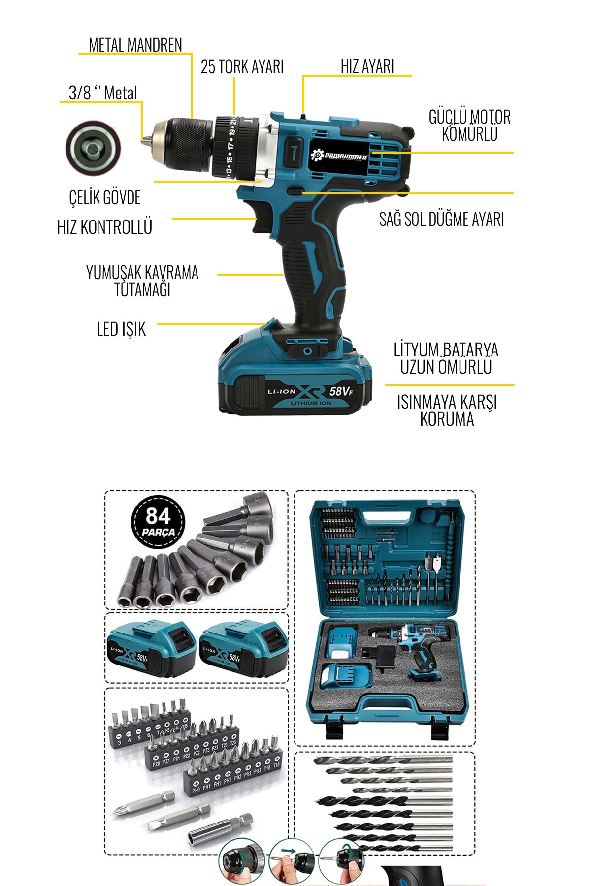 Prohummer 58vf yeni nesil vidalama matkap 84 parça ile en çok tercih edilen ürünler arasındadır. Ev işlerinizi kolaylıkla yapabilir ve atelyede kullanabileceğiniz özelliklere sahip bu ürün çift akü kapasitelidir.