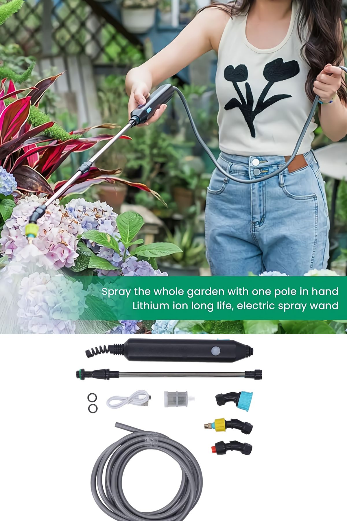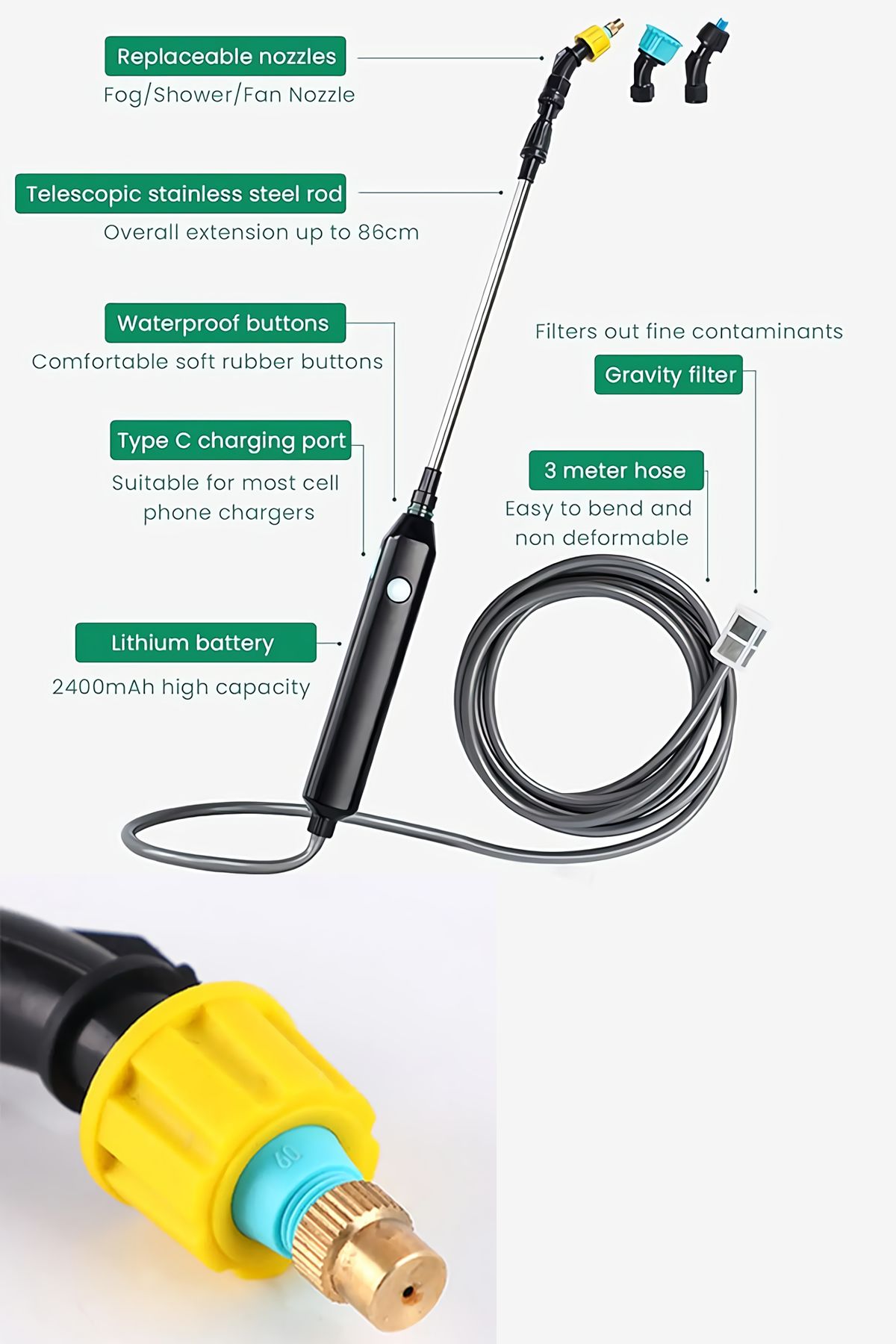 Şarj ettikten sonra 2 ila 3 saat arası kullanım imkanı sunmaktadır. Güçlü püskürtmesi ve başlıkları ile bahçe işlerinizi rahatlıkla yapabilirsiniz.