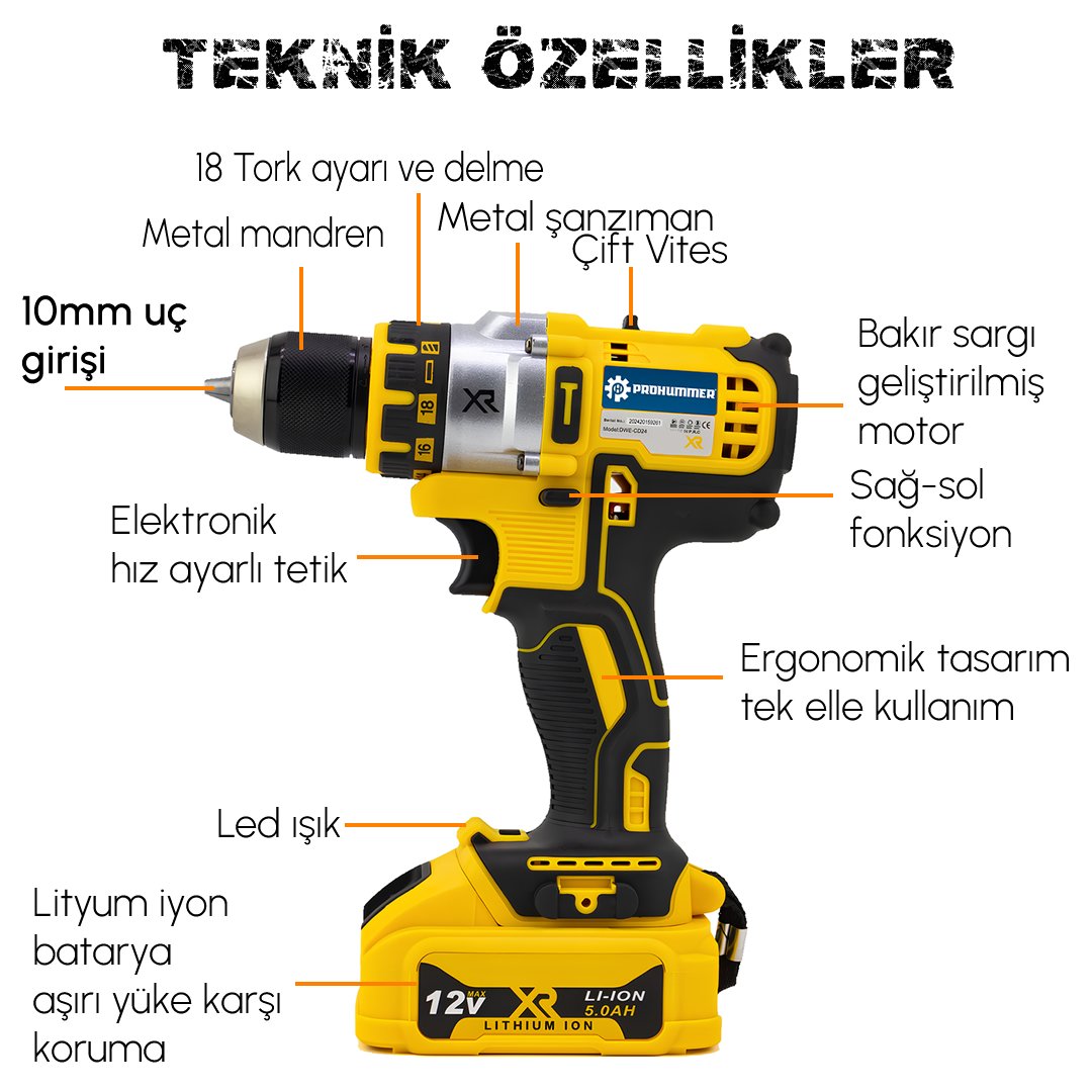 Prohummer xr darbesiz şarjlı vidalama matkabın boştaki devir sayısı 2000 dev/dk. olup delme ve vidalama modu bulunmaktadır. Max. 18 tork ayarı ile güçlü şanzıman yapısı sunmaktadır. Hız ayarı sayesinde zorlu işlerde 1.kademede daha çok güç üreterek performans sergiliyor.