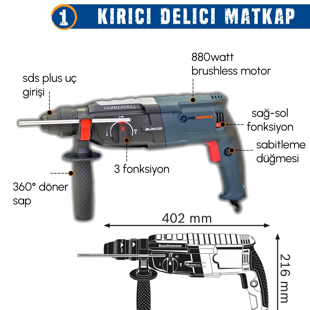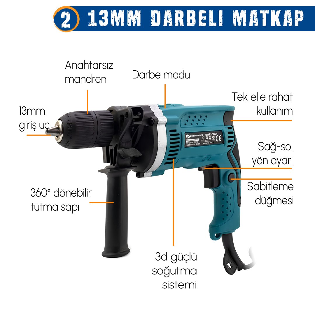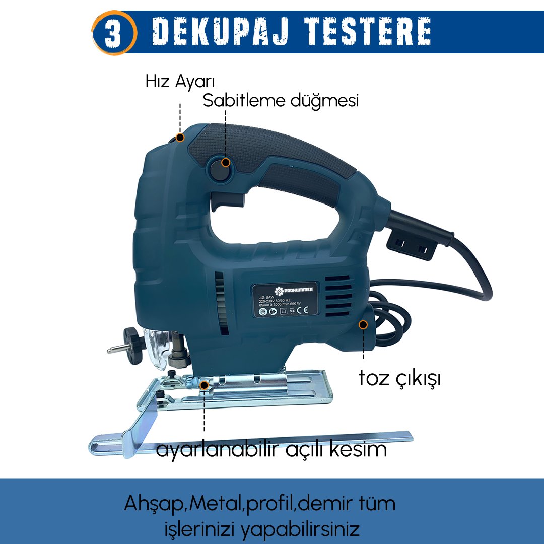 Prohummer elektrikli dörtlü set grubu darbeli vidalama matkap, kırıcı delici matkap , dekupaj testere ve avuç taşlama 4 ayrı ürün tek grup sette sizlere sunuluyor.