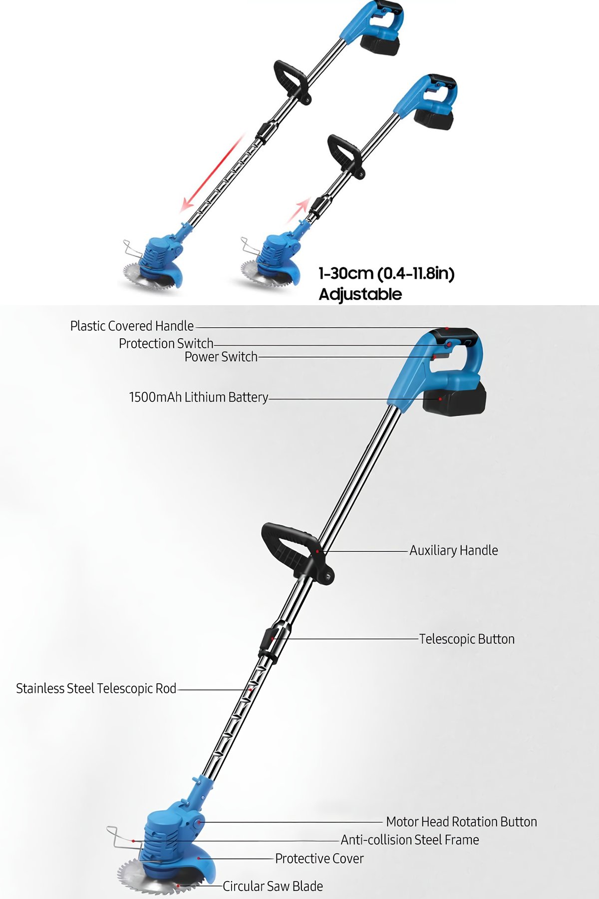 Ayarlanabilir teleskobik şarjlı çim biçme makinesi , yüksek kaliteli plastik, çelik boru, alüminyum boru, motor malzemesi, hafif ve rahat, ergonomik el tasarımı, her kullanıcı ve özellikle zayıf eli olanlar için rahat. Bu hafif düzelticiler Yaygın olarak kullanılır: Mükemmel yabani ot temizleme, en güzel çimleri biçmek daha düz görünmesini sağlar.