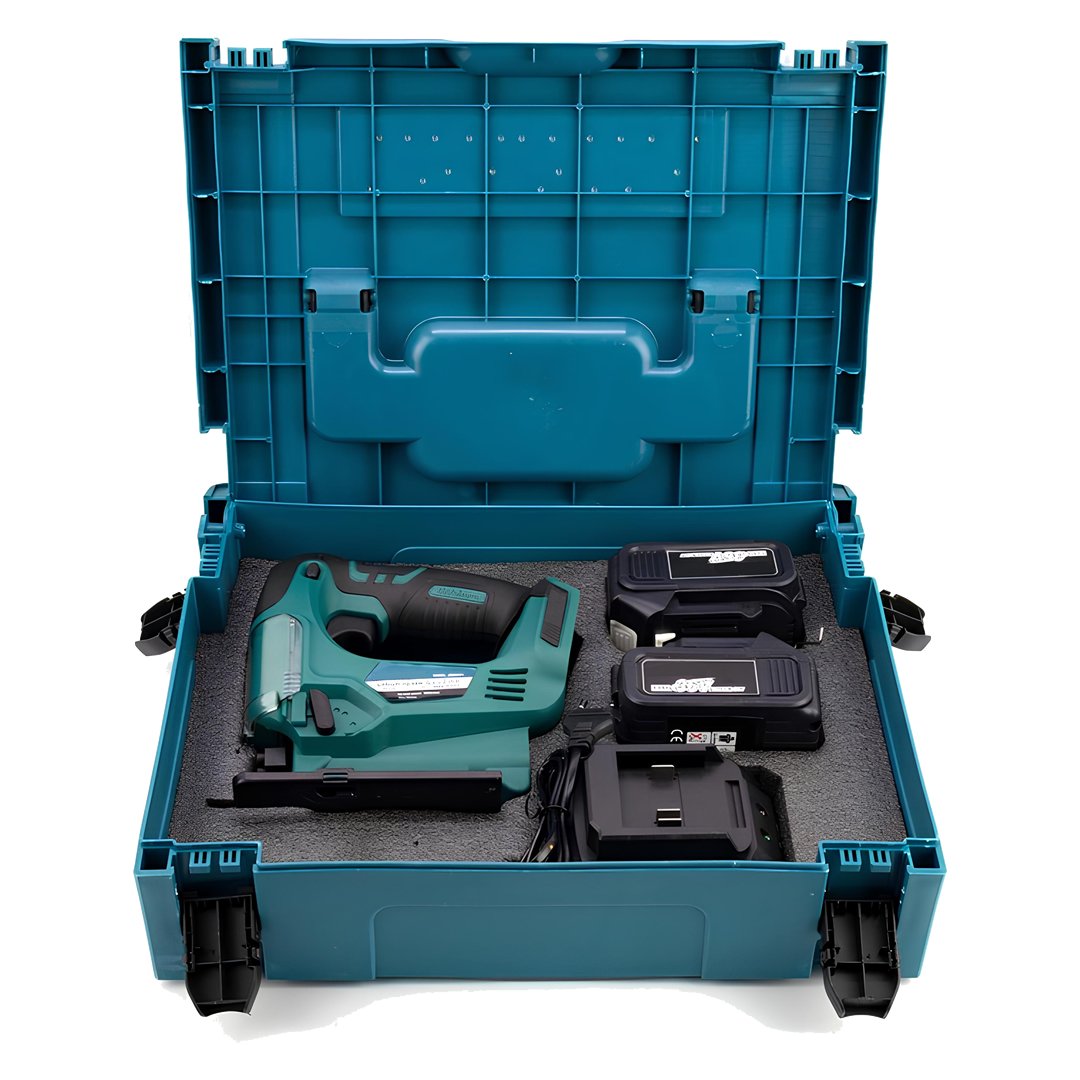 Şarjlı Dekupaj MK, 2 adet 36V 5.0 Ah lityum iyon pil ve hızlı şarj cihazı ile birlikte gelir. Pil göstergesi, pil seviyesini gösterir. Şarj cihazı, pilin tam şarj olmasını 60 dakika içinde sağlar. Ayrıca, Şarjlı Dekupaj MK, bıçakları ve aksesuarları saklamak için bir taşıma çantası ile birlikte gelir.