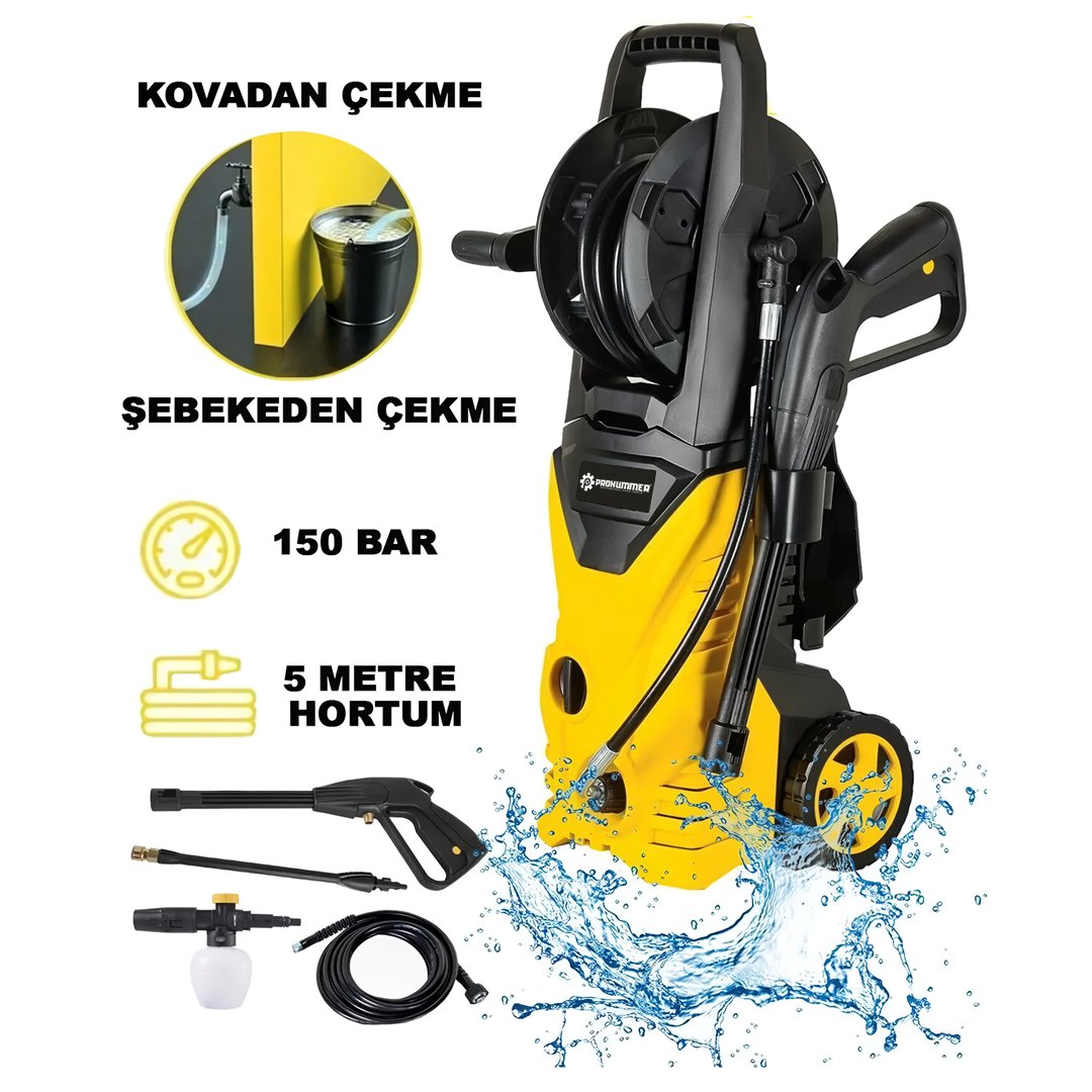 150 barlık yüksek basınç sayesinde, zorlu kirleri kolayca temizler. Bu basınç, özellikle araç yıkama, teras temizliği, bahçe mobilyaları gibi sert yüzeylerde etkili sonuçlar verir.