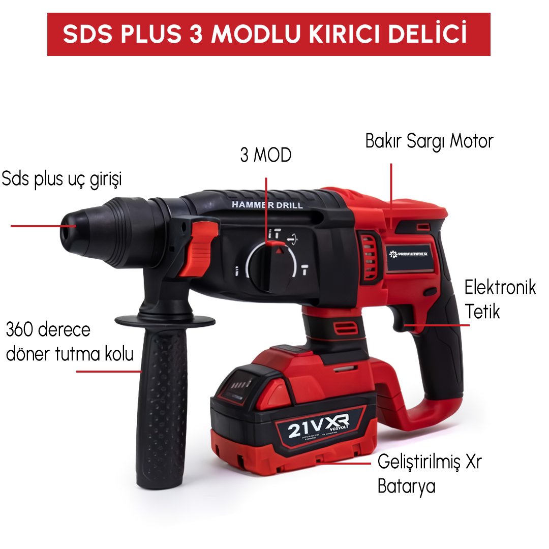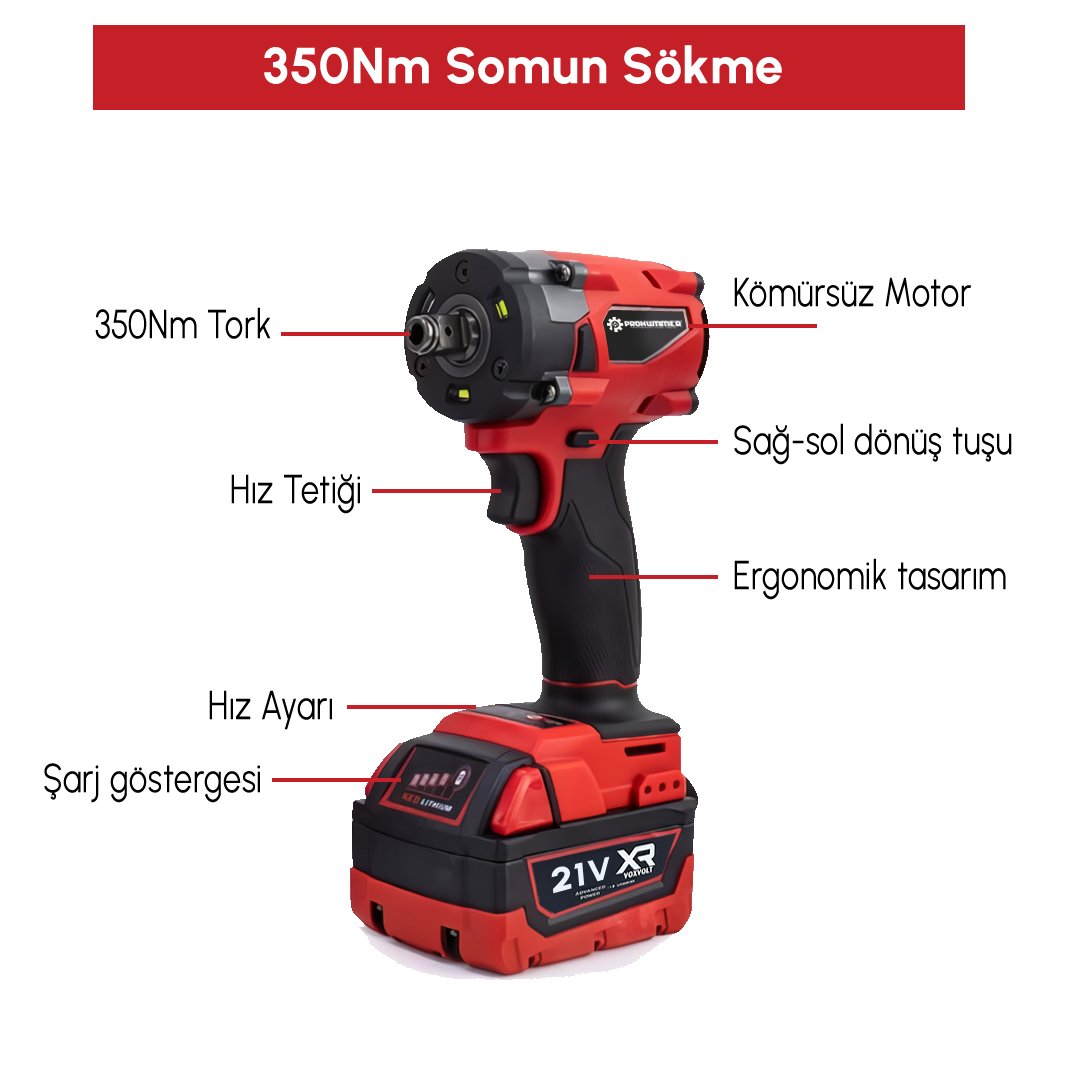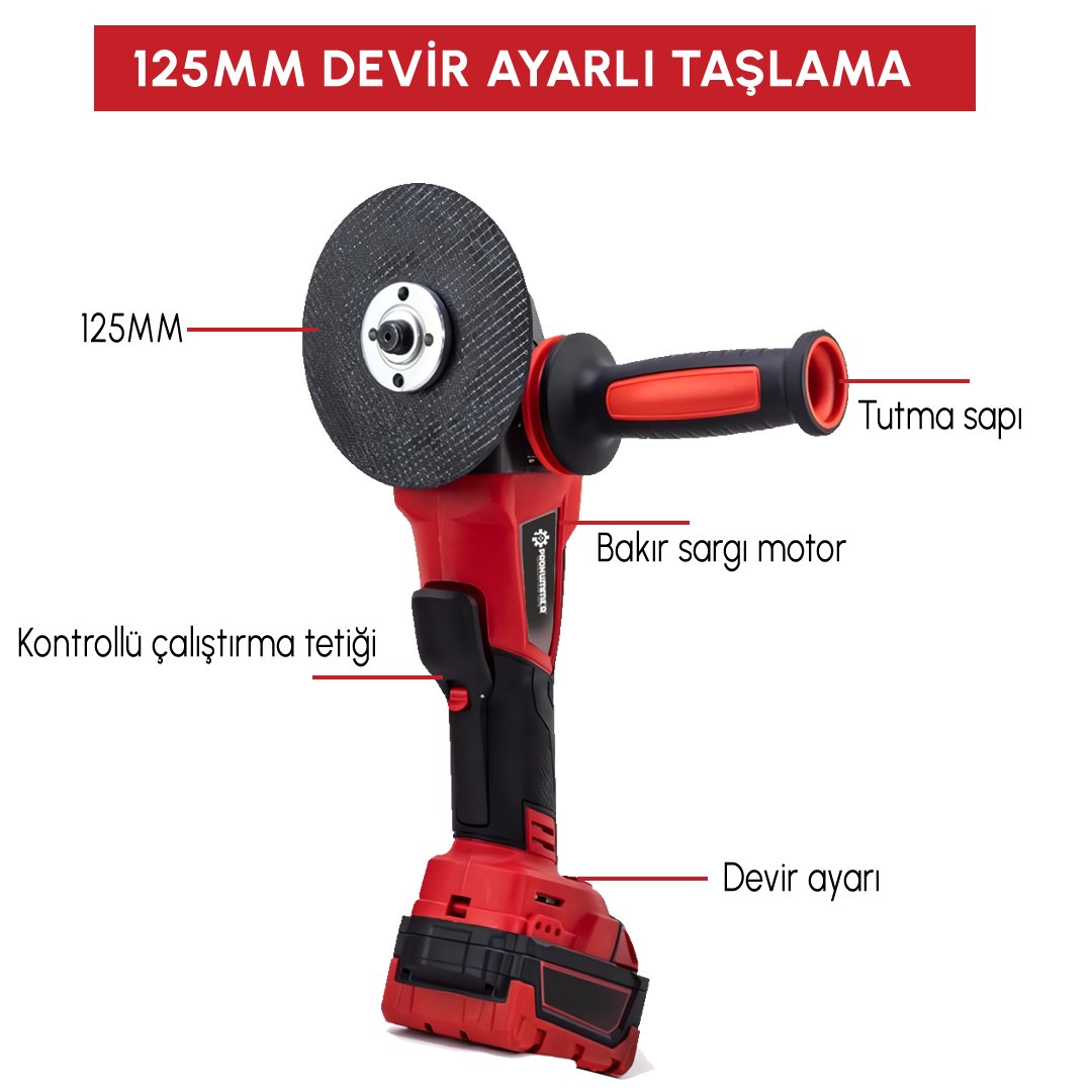 Ürün içeriği: 1 adet çantası, 1 adet somun sıkma , 1 adet vidalama , 1 adet kırıcı , 1 adet taşlama, 1 adet şarj cihazı, 3 adet batarya ve ekstra parçalar