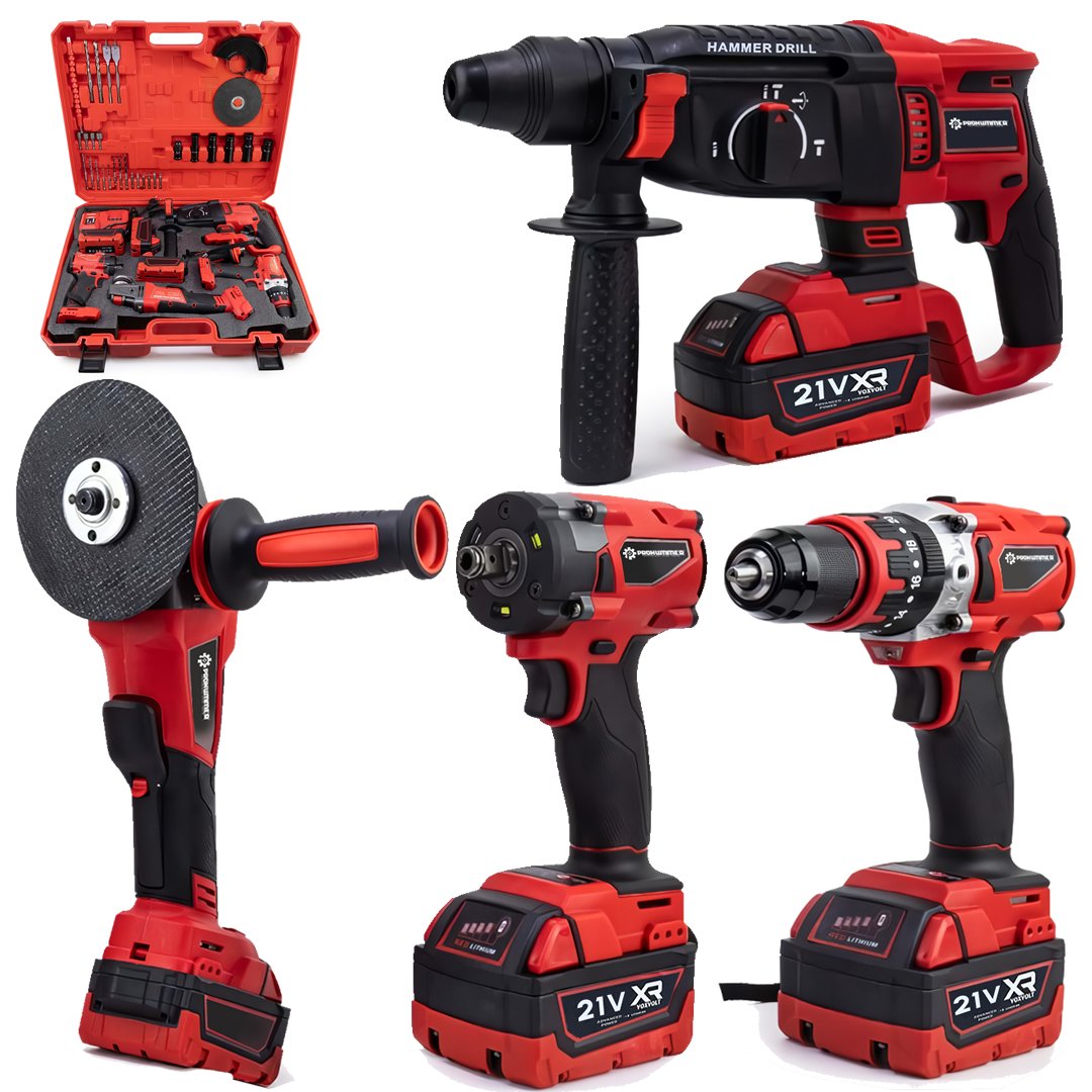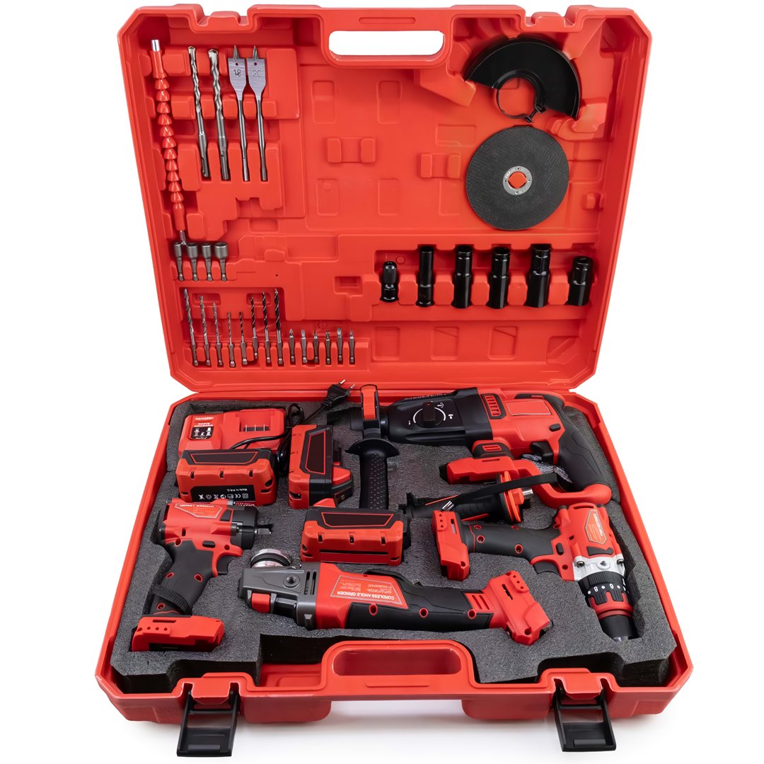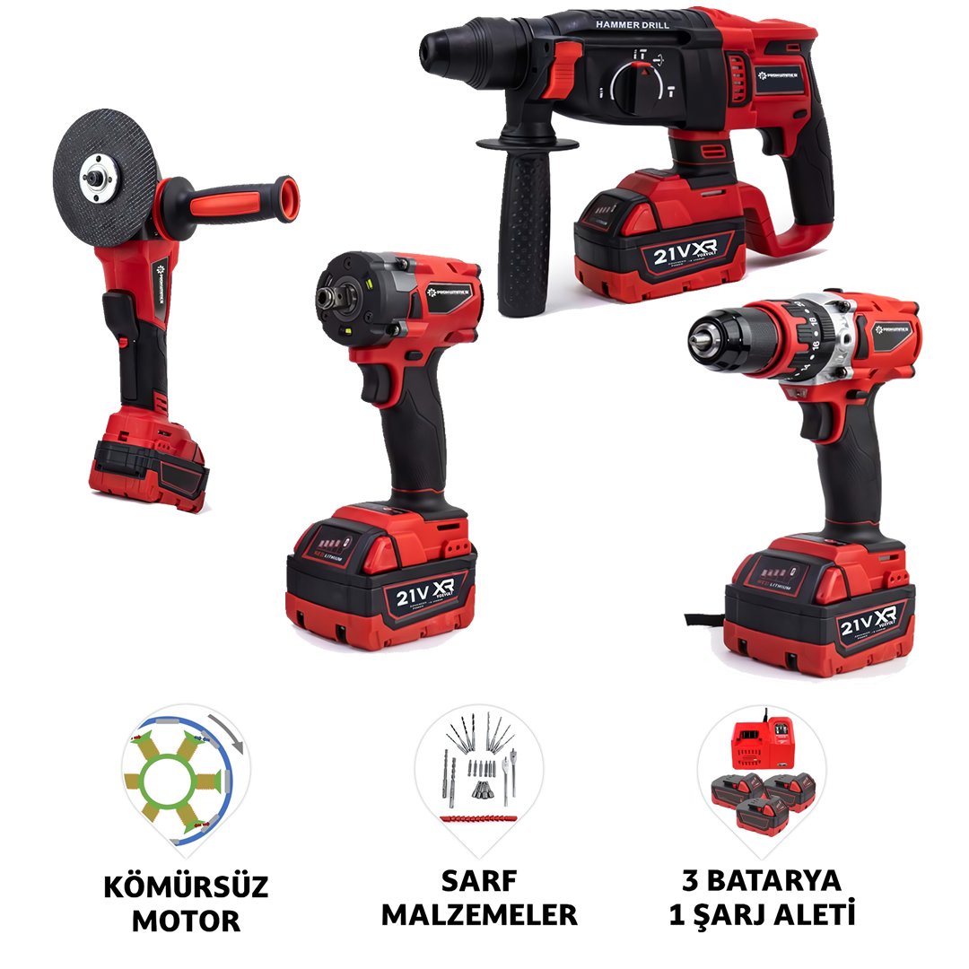 Ev ve atölye işlerinde kullanabileceğiniz bu sette 350 nm somun sökme, sds plus uç girişli kırıcı delici, 125 mm devir ayarlı avuç taşlama ve 13mm uç girişli vidalama matkap bulunmaktadır.
