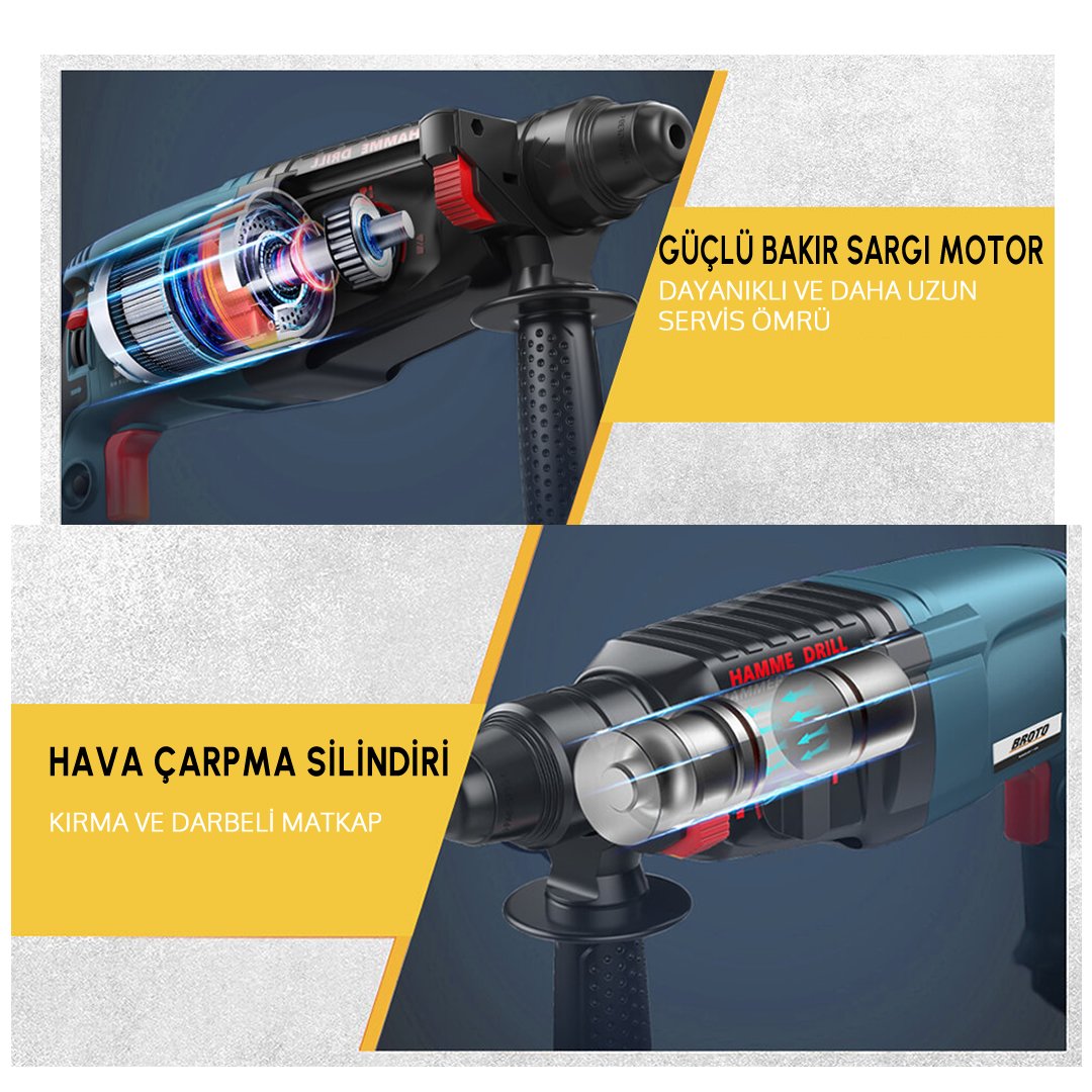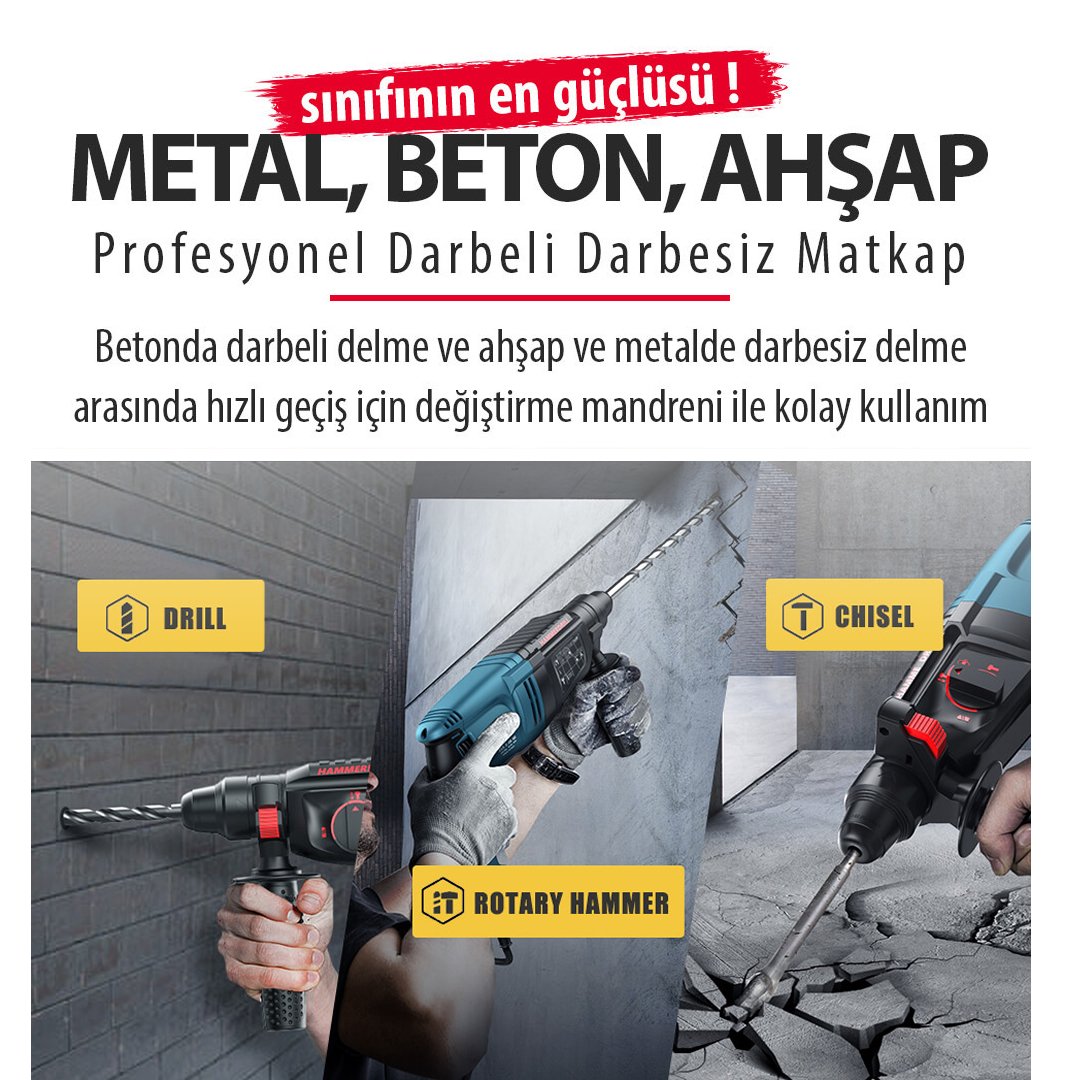 850W Metal Şanzıman Darbeli Matkap Kırıcı Delici Hilti 2-28mm, inşaat ve tadilat projelerinde güçlü ve dayanıklı performans sunar. 850W motor gücü, 0-1150r/min ve 0-5100r/min hız aralıkları ile çeşitli yüzeylerde etkili delme ve kırma işlemleri sağlar. 3,2 Joule darbe enerjisi ve darbeli çalışma özelliği ile beton, ahşap ve metal yüzeylerde üstün performans sunar. 13mm/26mm mandren kapasitesi ve 26mm beton delme kapasitesi ile ağır işlerde dahi yüksek verimlilik sağlar. Hafif ve ergonomik tasarımı sayesinde uzun süreli çalışmalarda rahat kullanım imkanı sunar.