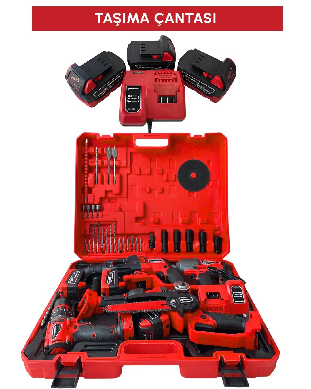 Set içeriği: 1 adet taşıma çantası, 1 adet somun sıkma , 1 adet vidalama , 1 adet kırıcı , 1 adet taşlama, 1 adet budama testere, 1 adet şarj cihazı, 3 adet batarya ve ekstra parçalar