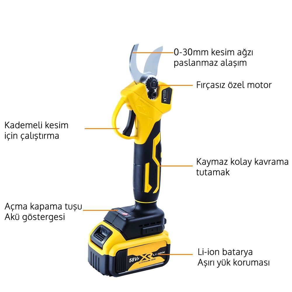 30mm maksimum budama makası ile meyve bahçeleri, üzüm bağlarında dalların kesilmesi ve kırpılması için akülü şarj edilebilir budama makası.