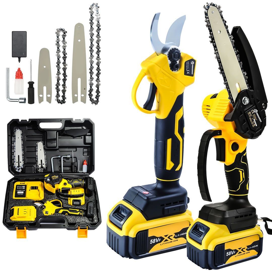Professional Şarjlı Dal Budama Testeresi ve Budama makası 2 li set bir arada, 58vf 5ah çift akü ile işlerinizi kolaylıkla bitirin.Tek batarya ile 35 dk kesme imkanı sunuyor. 10cm ve 15 cm pala boyu ile tüm dalları kolaylıkla kesebilirsiniz.